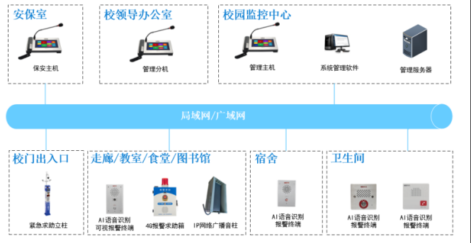 AI预警防欺凌报警系统AI语音识别和IP网络音视频通讯技术为基础,搭建的一套全